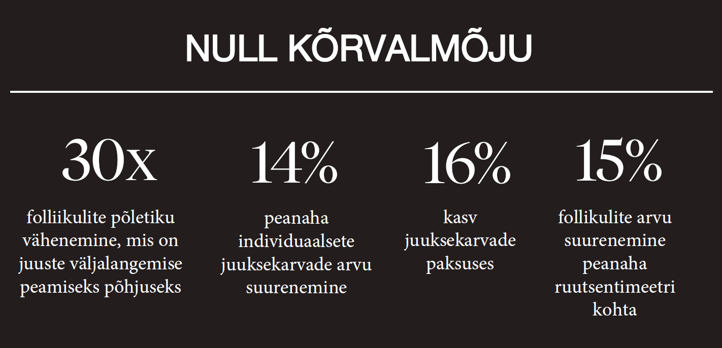 • Noorendavate signaalide taastamine peanahas, et pikendada juuste kasvu aktiivset faasi (anageeni) ja lühendada juuste kasvu passiivseid faase (katageeni ja telogeeni)